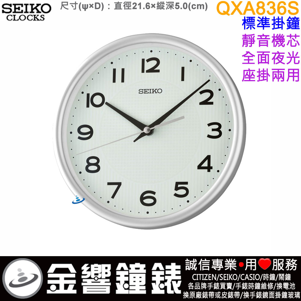 金響鐘錶精品購物網::專賣原廠公司貨:::歡迎議價或門市購買全年優惠 EST.1995 » 時鐘系列 » SEIKO 標準掛鐘 » SEIKO 標準掛鐘(滑動式秒針) » ●金響鐘錶,現貨,SEIKO QXA836S(公司貨,保固1年):::SEIKO 掛鐘,靜音機芯,座掛兩用,全面夜光,時尚掛鐘,直徑21.6cm,時鐘,QXA-836S |
