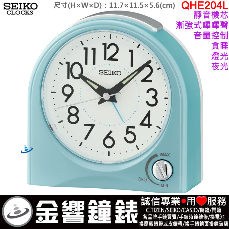 金響鐘錶精品購物網::專賣原廠公司貨:::歡迎議價或門市購買全年優惠 EST.1995 » 時鐘系列 » 鬧鐘 Alarm-Clocks » 指針型鬧鐘(滑動式秒針) » 【金響鐘錶】現貨,SEIKO QHE204L(公司貨,保固1年):::SEIKO,漸強式嗶嗶聲鬧鈴,音量控制,靜音機芯,貪睡,燈光,夜光,QHE-204L |