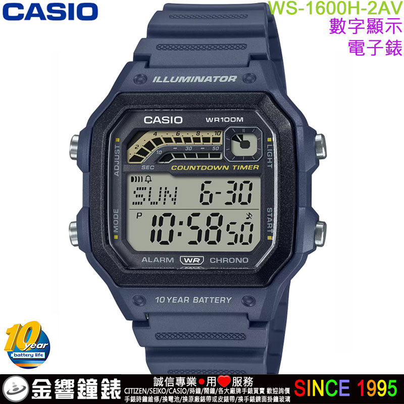 金響鐘錶精品購物網::專賣原廠公司貨:::歡迎議價或門市購買全年優惠 EST.1995 » CASIO系列 » FASHION 時尚錶款 » 【金響鐘錶】預購,CASIO WS-1600H-2AVDF(公司貨,保固1年):::10年電力,電子錶,防水100米,碼錶計時,鬧鈴,手錶,WS1600H |